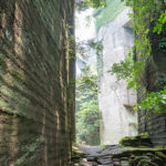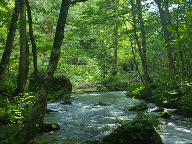 苔むした岩や倒木の間を縫うように流れる水は、静けさの中に力強さを秘めています。森の木々は光をやわらかく差し込み、鮮やかな緑と白い水しぶきが織りなすコントラストは、まさに自然の芸術そのもの。